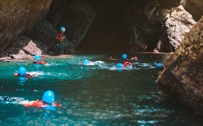 This Coasteering route starts with a rappel 20 meters above the water. In the middle of